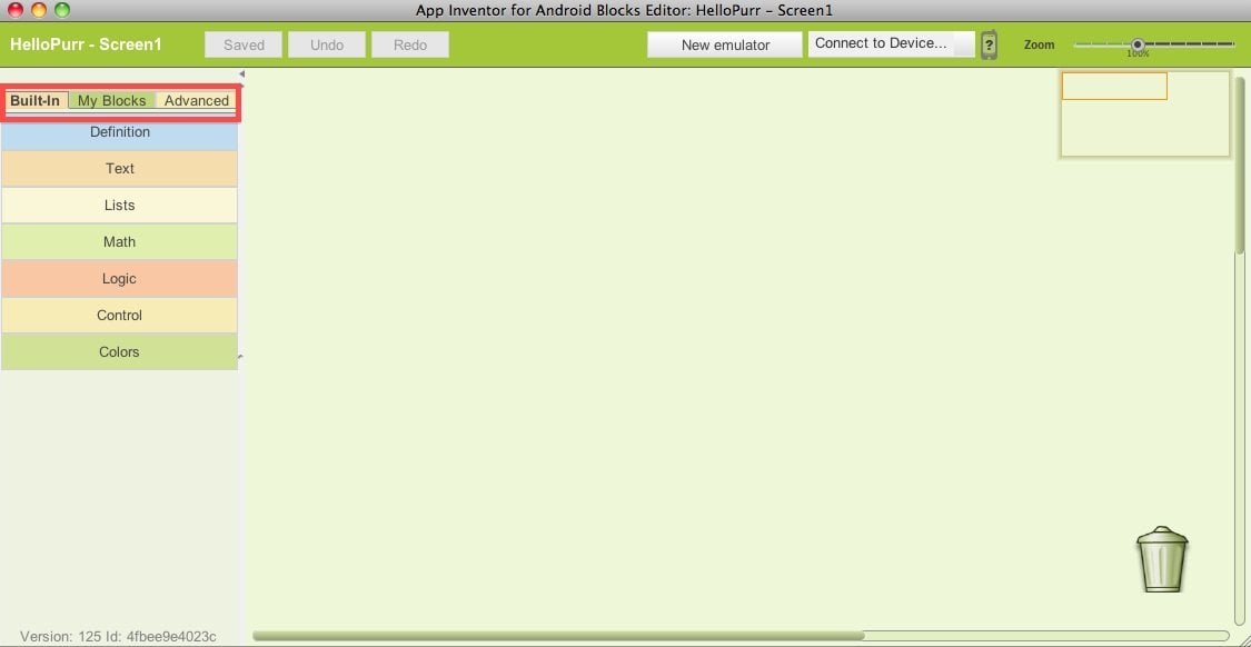 Tasarımcıyla beraber bir pencere daha açmamız gerekecektir. Blok editörü (Blocks Editor) resimde kırmızıyla işaretlenen butondur. Butona tıklatıktan sonra aşağıdaki gibi pencere gelecektir.