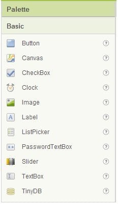Uygulamanın bileşenleri App Inventor’da sol tarafta bulunuyor. Bileşenlerin arasında projede kullanılan temel araçlar bulunuyor: Buton, resim, onay kutucuğu ve diğerleri.