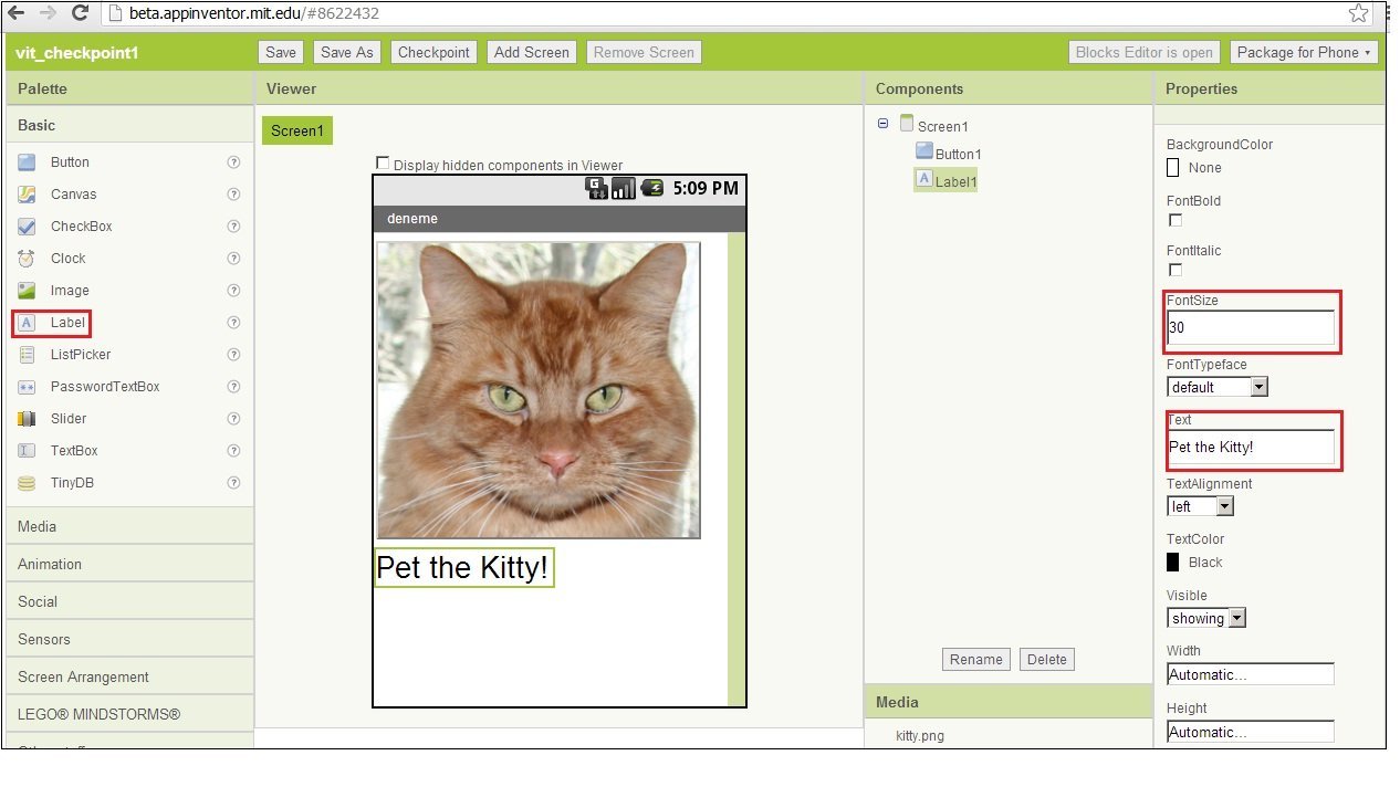 Sol taraftan etiket (Label) bileşenini seçiyoruz. Sağ taraftan etiketin özelliği değiştiriyoruz. FontSize 30 olsun ve Text özelliği olarak Pet the Kitty! metnini yazıyoruz.