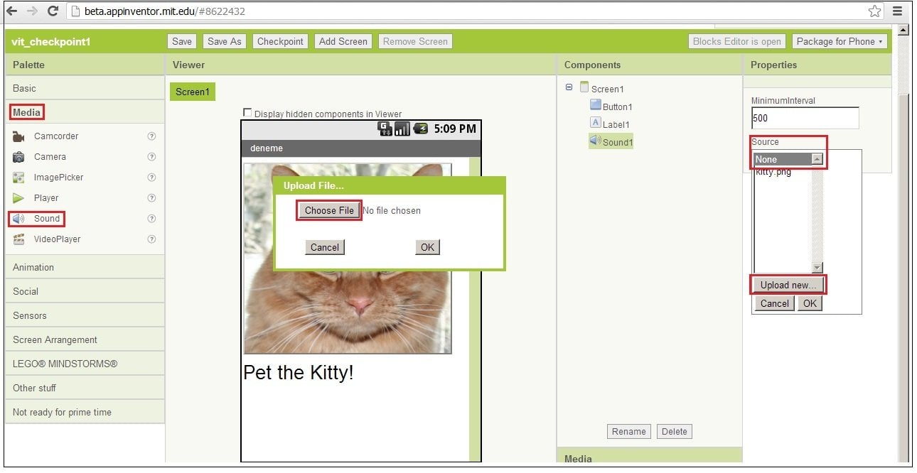 Daha önce yüklediğimiz kedinin sesini projeye ekleyelim. Sol taraftan Media > Sound bileşenini Viewer’a taşıyoruz. Sağ tarafta Source (Kaynak) > None > Upload Now > Choose File seçiyoruz.