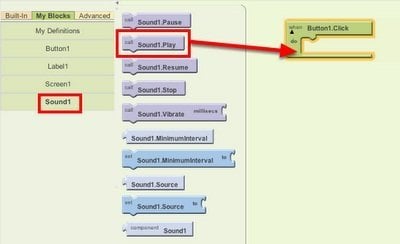 Yeşil olan bloklar olay işleyici (event handler) fonksiyonu taşıyorlar. İşleyici bloklar, olaylara ne işlem yapılacağını belirtiyorlar. Yani yapılmasını istediğimiz işi, işleyici bloklara atıyoruz. Mesela kullanıcı butona bastı, telefon da bu yüzden titreşti. Sonra Sound1 seçiyoruz ve seçeneklerden Sound1.Play2’yı seçip Button1.Click üzerine taşıyoruz. Mor ve mavi bloklar, komut (Command) bloklarıdır. Komut bloklar (Command blocks) olay işleyiciyi (event handler) içeriye yerleştiriyorlar.