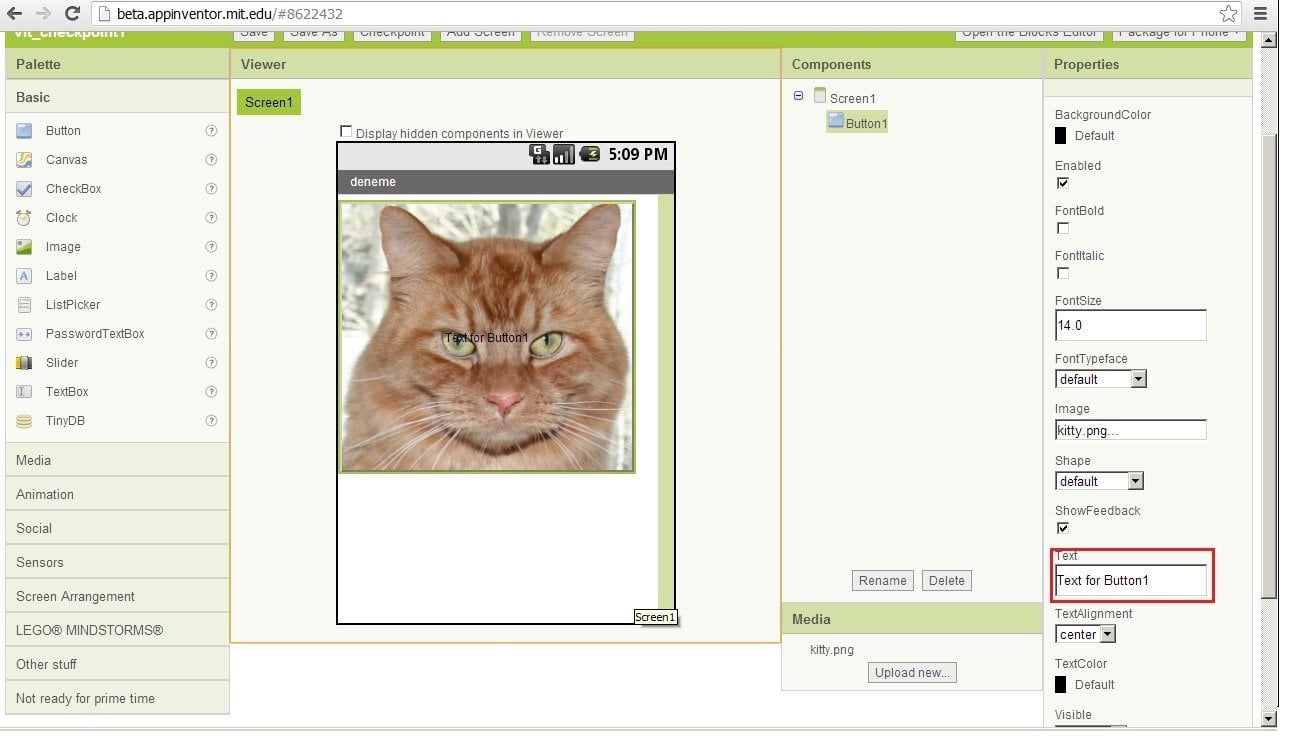 Birinci aşamada butonu tasarımcıya taşıyoruz. İkinci aşamada butonun görüntüyü değiştiriyoruz. Butona kedinin resmini yapıştıracağız. Bunu yapmak için sağ taraftan Image > None ve Upload New butonuna basıyoruz. Çıkan pencerede Choose File butonuna basıyoruz ve bilgisayarda daha önce kaydettiğimiz kedinin resmini seçiyoruz.