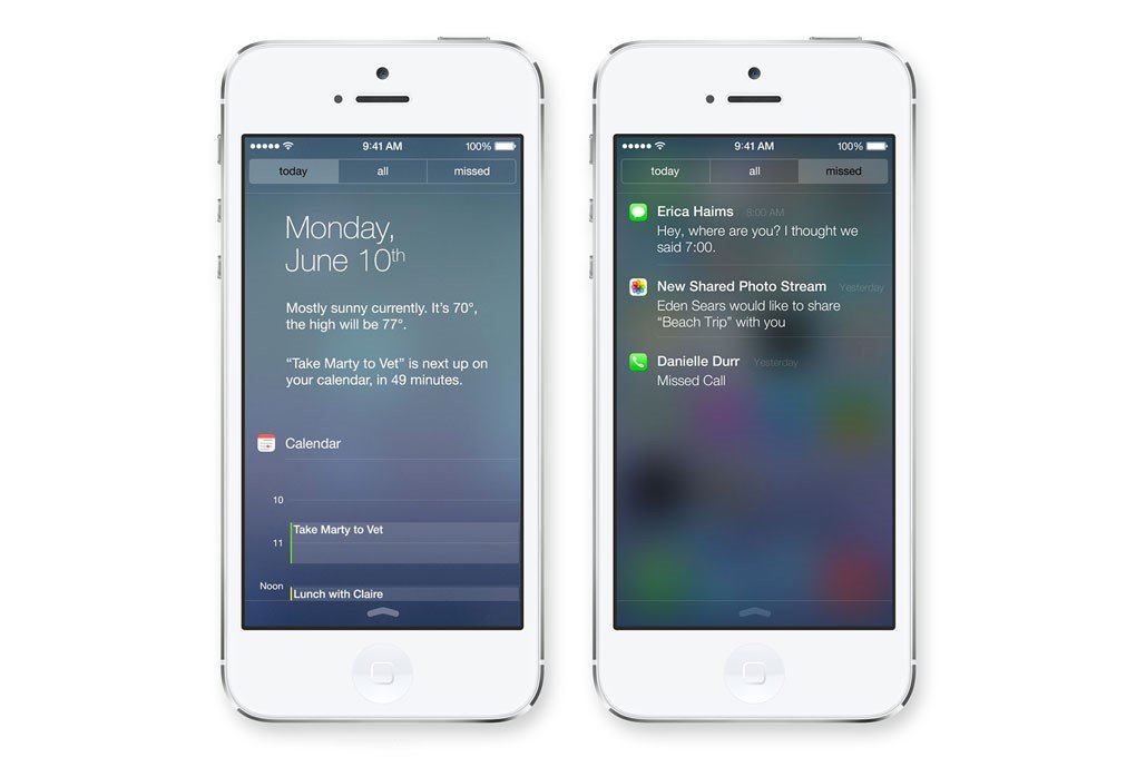 Tasarım farklılıkları bildirim çubuğunu görüntülediğimizde de karşımıza çıkıyor. Daha önce kullanılan gri kumaş tarzı arka plana sahip bildirim çubuğu artık yerini daha saydam bir arka plana bırakmış. Eski bildirim çubuğunda gelen tüm bildirimleri tek bir sayfada görüntülerken iOS7 ile beraber kategorilere ayrılmış. Bulunduğunuz güne ait bildirimleri ayrı bir şekilde görüntülerken, tüm bildirimleri veya cevapsız çağrılarınızı ayrı bir ekranda görüntüleyebiliyorsunuz. Jailbreak’li telefonlarda kullanılan ve oldukça popüler olan Intellix bildirim çubuğu uygulamasının bir nevi daha tasarımı güzelleştirilmiş halı. Intellix’de bildirim çubuğu yine kategorilere ayrılmış olup yan tarafa doğru geçiş yaptığınız zaman Facebook ve Twitter Timeline’larınızı görebiliyordunuz. Bu yeni çubukta ise bildirimler bölümlendirilip daha sadeleştirilmiş.