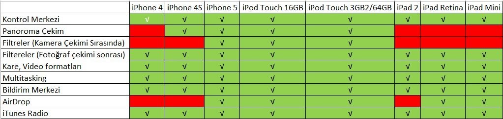 iOS 7 diğer İOS sürümlerinde olduğu gibi her cihaza eşit şekilde dağıtılmayacak. 3GS modelinde tamamen yükleme şansınız yok. İPhone 4 ve sonraki modellere dağıtılacak. Ancak tabiî ki her özelliği de her telefonda aktif olmayacak. Bir iPhone 5 cihazında tüm yeni özellikleri kullanırken, iPhone 4’te kısıtlı özelliklerden faydalanabileceksiniz. Tam olarak hangi özelliğin hangi cihaza geleceği net değil ancak aşağıdaki tabloda bildiğimiz özellikleri listelemeye çalıştım.
