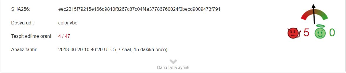 - C:\Users\(Kullanıcı adınız)\AppData\Roaming\Adobe klasörünün içinde color.vbe isimli bir script dosyası oluşuyor ve açılışta otomatik olarak başlatılacak programların arasına katılıyor. İnternete bağlanan Script Dosyası daha birçok zararlıyı bilgisayarınıza indirmeye başlıyor ve sistem dosyalarını virüslü dosyalar ile değiştiriyor. Bu scripti tespit etme konusunda ise güvenlik yazılımları tabiri caizse çuvallıyor. Sadece 4 güvenlik yazılımı bu zararlıyı belirleyebiliyor. Üstelik bu 4 güvenlik yazılımından 2 tanesi svchost.exe zararlısını tespit edemediği için büyük bir zaafiyet oluşuyor.
