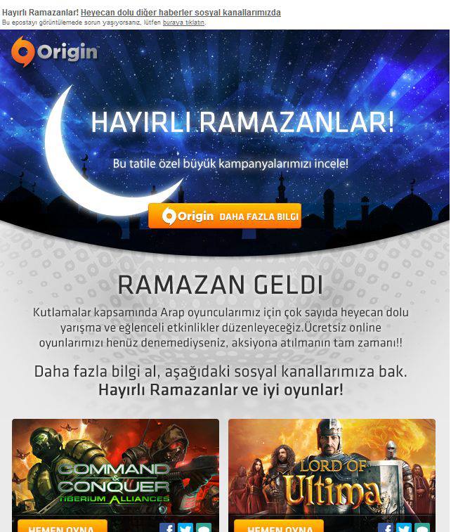 İslam dünyası tarafından kutsal kabul edilen Ramazan ayına girilmesiyle beraber firmalardan kutlama e-mail’leri gönderilmeye başladı. Bunlardan biri de EA’in Origin servisinden geldi.