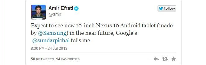 Wall Street Journal yazarı Amir Efrati, Twitter’da paylaştığı bir gönderide, Google’ın yeni Nexus tableti için Samsung’la anlaşmaya vardığını belirtti. Bu haberin kendisine Google çalışanı Sundar Pichai tarafından verildiğini söyleyen Efrati, yeni Nexus’ın 10 inç ekran boyutuna sahip olacağını duyurdu.