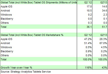 Ünlü analiz firması Strategy Analystics’in yaptığı araştırmalar, 2013’ün ikinci çeyreğindeki tablet pazarını gözler önüne seriyor.