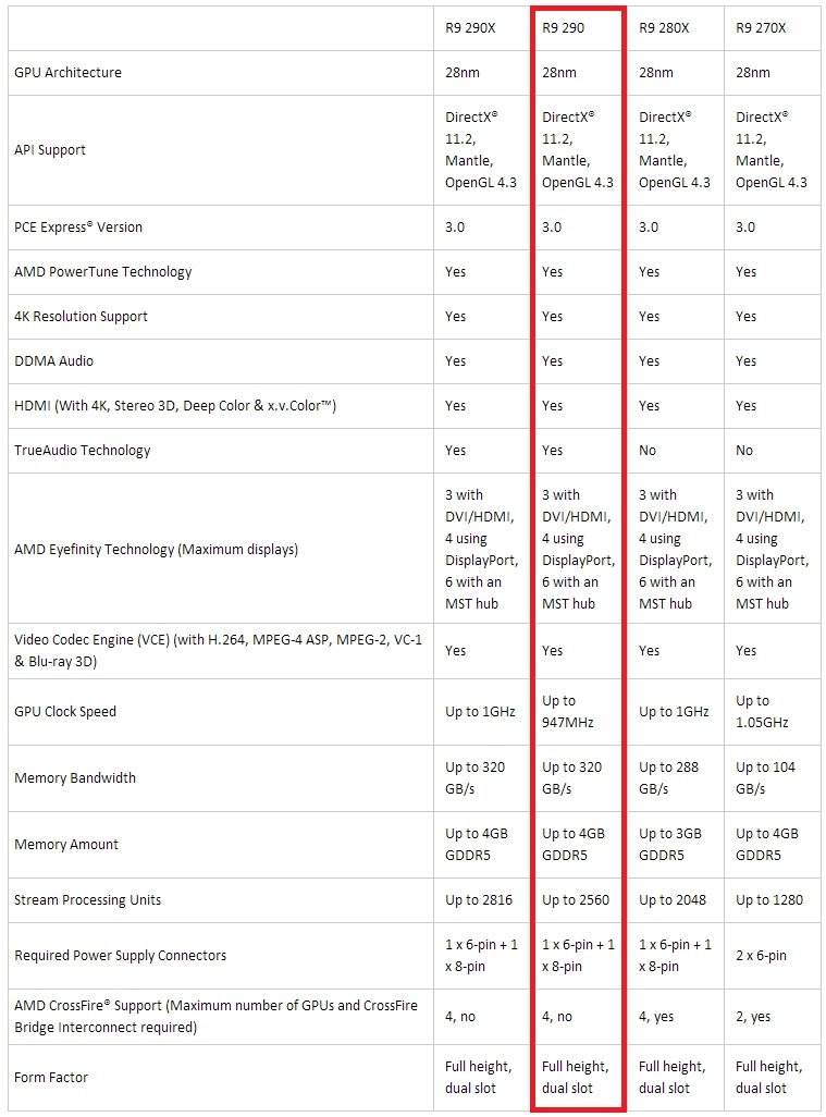 Radeon R9 290’da farklı olarak; GPU hızı, bir üst modelinden 53MHz daha düşük. Ancak 4GB’lık GDDR5 bellek sığası ve 1250MHz’lik bellek hızı korunmuş.