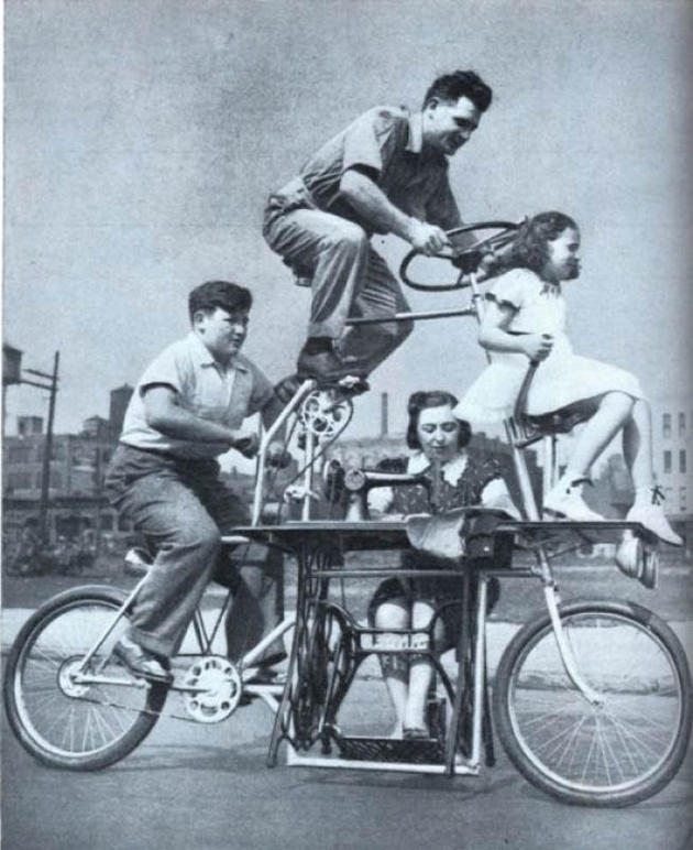 Pazar günü ailecek dışarı çıkmak istediğinizde kullanmak istediğiniz araç bu! Baba ve oğul olarak bisikleti ilerletirken, kızınızı da ön tarafa oturtup manzara seyretmesini sağlayabilirsiniz. Haa unutmadan! Bir de dikiş makinesi var. Evin annesi boş mu dursun? Siz gezerken o da sökükleri diker.