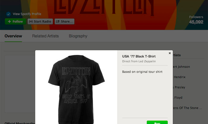 Hali hazırda Spotify’den 200 farklı müzisyenin eşyaları bulunuyor. Bunların arasında Led Zeppelin, Beastie Boys, Bon Jovi gibi ünlü gruplar var. Yeni özellik sayesinde duyulmamış müzisyenler ve tasarım konusunda uzman kullanıcılar da ürünlerini pazara ekleyebilecek.