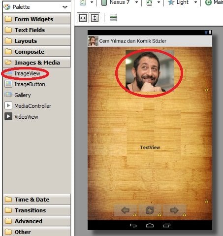 Uygulamamız üç tane butondan, TextView’den ve bir tane fotoğraftan (image) oluşacak. Butonlar üç işlem (ileri, geri ve rastgele komik sözleri göstermek) yapacaktır. TextView’un amacı komik sözleri göstermektir, ImageView Cem Yılmaz’ın fotoğrafını gösterecektir. Hazır uygulamayı buradan indirebilirsiniz.