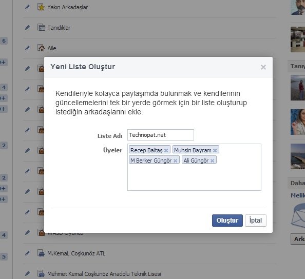 Tanıdıklar: Haber Kaynağı’nda (ana sayfada) daha az görmek istediğiniz arkadaşlarınızı ekleyebileceğiniz bir liste. Ayıp olmasın diye eklediğiniz ancak çok fazla birbirinizden haberdar olmak istemediğiniz kişiler için kullanılabilecek bir liste. Akrabalar için kullanılmaya müsait.