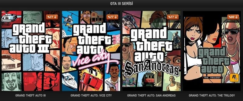 Açık dünya konseptine dayanan, yüzlerce saat oynama süresi tanıyan Grand Theft Auto serisinin PC için çıkan 3. oyunundan son oyunu GTA IV’e kadar devasa indirimler bulunuyor.