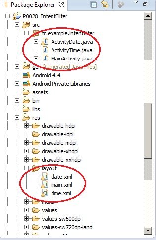 Aynı yerde Category oluşturuyoruz ve name alanında android.intent.category.DEFAULT satırı giriyoruz. ActivityDate etkileşim için aynı adımları gerçekleşiyoruz. ActivityTime etkileşim için time.xml layout’u oluşturuyoruz: