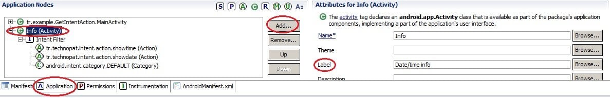 Yeni etkileşimi Manifest’e kayıt etmesini ve Intent Filter ile beraber iki action, category oluşturmayı unutmuyoruz. Label alanında Date/time info giriyoruz.