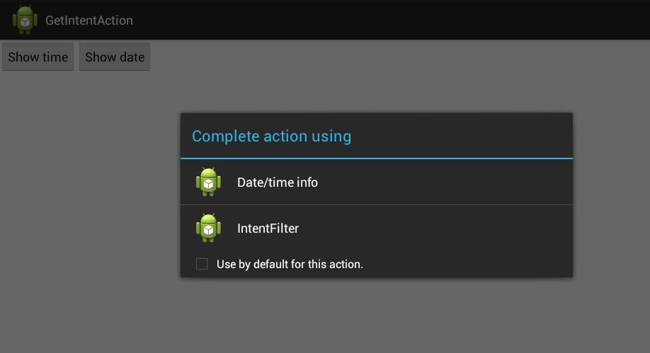 IntentFilter seçildiği zaman geçen dersten etkileşimi gösteriyor. Şimdi Show date butonuna basalım: