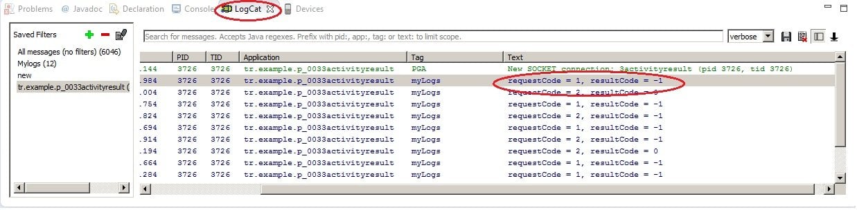Hata olduğunu mesajdan görüyoruz. Bildirime bakalım: requestCode = 1, resultCode = 0 requestCode = 1 – doğru “Color” butonuna bastık (REQUEST_CODE_COLOR) resultCode = 0, RESULT_CANCELED, değeri demek ki çağrı başarısızlıkla sonuçlandı. MainActivity.java dosyanın kodu: