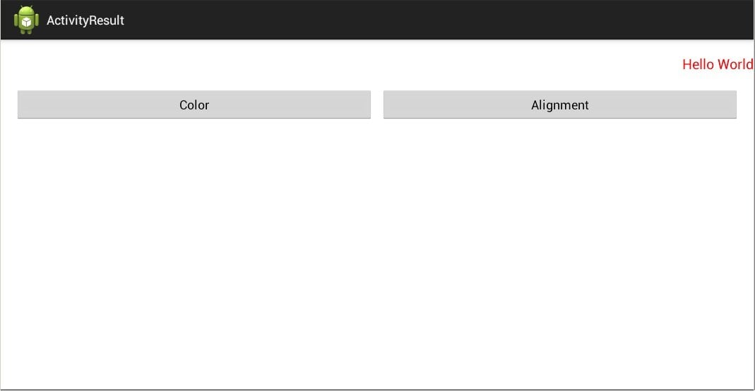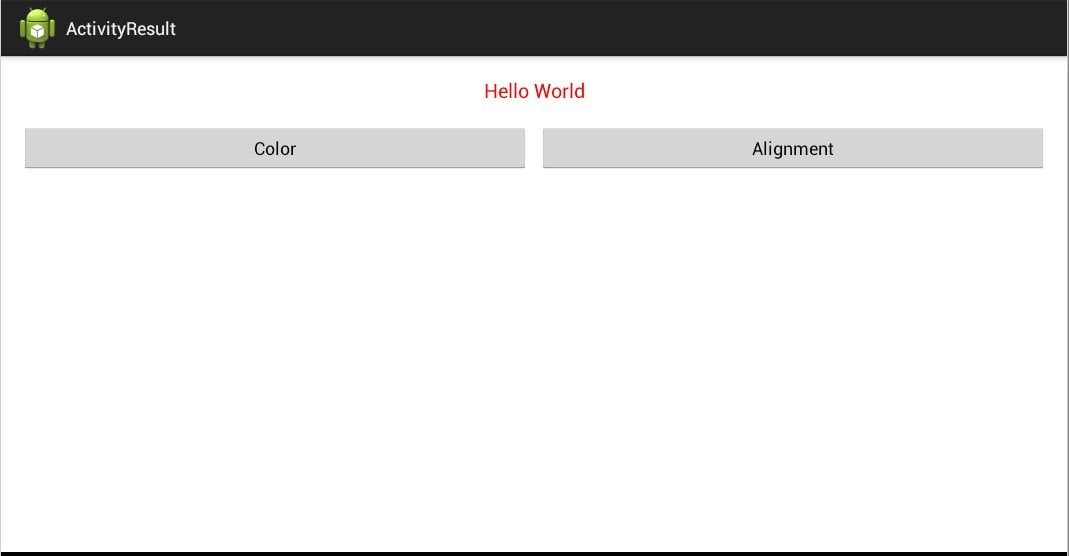 Ekrandaki bulunan bileşenleri belirtiyoruz. Butonlara işletici (this) bağlıyoruz. OnClick metodunda Intent’i oluşturuyoruz ve v.getID () metodu kullanarak basılan butonu buluyoruz. Intent’e “color”- ismi ve renginin değeri (Color.Red, Color.Green,Color.Blue) yerleştiriyoruz. setResult metodu kullanarak statüsü RESULT_OK ve sonuç olarak intent nesneyi kullanacağımızı belirtiyoruz. Etkileşimi kapatıyoruz (finish ()). Renkleri kullanmak için sistemde bulunan değerleri kullanacağız. Aynı şekilde ikinci etkileşimi oluşturuyoruz. AlignActivity için layout dosyayı oluşturalım. İsmi align.xml olsun: