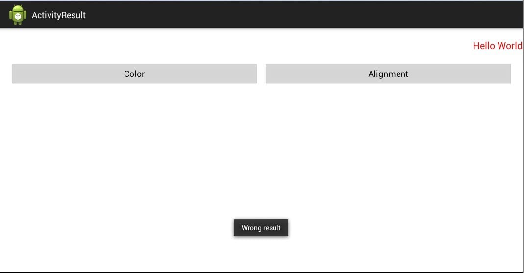 Uygulamanın çalışmasını daha iyi anlamak için bildirimi (Log.d) kullanacağız. Bildirime requestCode ve resultCode parametrelerinin değerini yazdıracağız. ColorActivity ve AlignActivity etkileşimde setResult metodunda RESULT_OK statüsü yerleştiriyorduk. Bu demektir ki onActivityResult metodunda RESULT_OK çağrısının başarılı olup olmadığını ifade edecek. Çağrı başarılı olduğu zaman (resultCode = RESULT_OK) requestCode parametresine bakıyoruz. requestCode REQUEST_CODE_COLOR’a eşit olduğu zaman etkileşime sonucu gönderdiğini ifade ediyor. Intent’i (data) kullanarak “color” isimli nesneyi alıyoruz ve değeri TextView’e yerleştiriyoruz. Color.WHITE getInExtra metodunda varsayılan parametre olarak kullanılıyor. Yani eğer Intent “color” ismi nesneyi bulamıyorsa beyaz (WHITE) rengi kullanılacak. Aynı olay REQUEST_CODE_ALIGN için de geçerlidir. Eğer resultCode RESULT_OK’ye eşit değilse demek ki hata oluştu. Böyle bir olay oluştuğu zaman ekrana “Wrong result” mesajı göndereceğiz. Ekranda seçim yapmadan geri (Back) butonuna bastığı zaman böyle bir olay karşımıza çıkabilir. Uygulamayı kaydedelim ve çalıştıralım:
