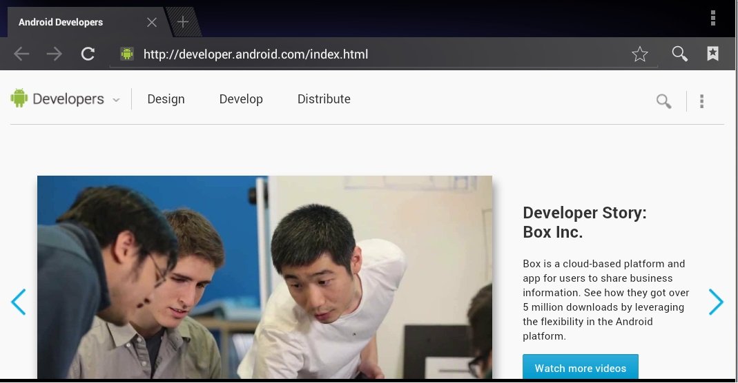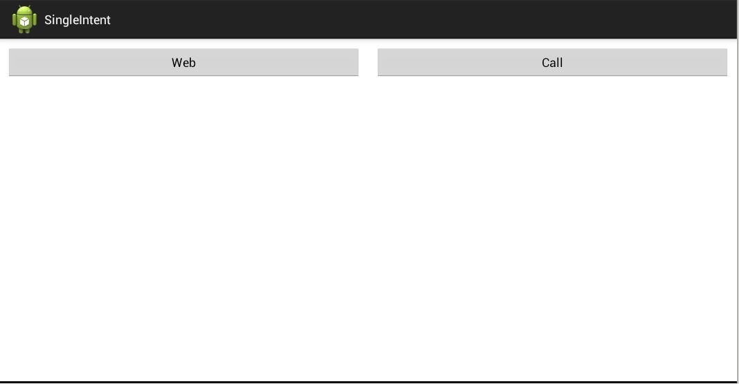 import android.app.Activity; import android.content.Intent; import android.net.Uri; import android.os.Bundle; import android.view.View; import android.view.View.OnClickListener; import android.widget.Button; public class MainActivity extends Activity implements OnClickListener { Button btnWeb; Button btnCall; /** Called when the activity is first created. */ @Override public void onCreate(Bundle savedInstanceState) { super.onCreate(savedInstanceState); setContentView(R.layout.main); btnWeb = (Button) findViewById(R.id.btnWeb); btnCall = (Button) findViewById(R.id.btnCall); btnWeb.setOnClickListener(this); btnCall.setOnClickListener(this); } @Override public void onClick(View v) { Intent intent; switch (v.getId()) { case R.id.btnWeb: intent = new Intent(Intent.ACTION_VIEW, Uri.parse("http://developer.android.com")); startActivity(intent); break; case R.id.btnCall: intent = new Intent(Intent.ACTION_DIAL); intent.setData(Uri.parse("tel:12345")); startActivity(intent); break; } } }