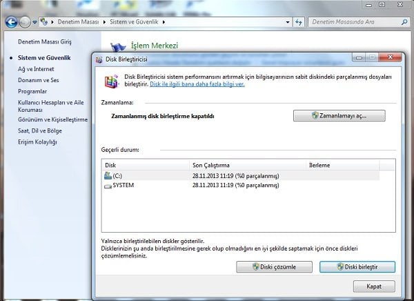 Windows 7 ve 8 ile çalışırken Denetim Masası/Sistem ve Güvenlik sekmesi altındaki Yönetimsel Araçlar maddesi altından “Sürücülerinizi birleştirin…” seçeneğine tıklayın. Buradan sürücü birleştirme işlemini devre dışı bırakın. SSD dışındaki klasik sabit disklerinize buradan “defrag” yapabilirsiniz, ancak otomatik yapılmasını genel olarak kapatın.