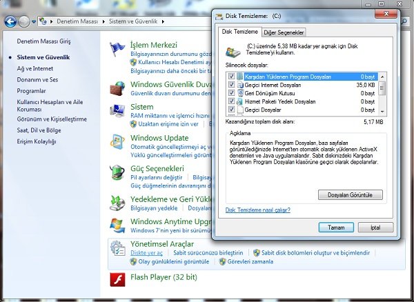 Peki periyodik temizlik için ne yapabilirsiniz? Yapabileceğiniz en temel ve büyük çaplı temizlik işlemi, Windows 7 Denetim Masası altında bulunan Performans Bilgileri ve Araçları penceresindeki Disk Temizlemeyi Aç sekmesinden mümkün olacaktır. Özellikle Windows Update sonrasında sabit diskte büyük miktarda çöp dosya birikir ve yer kaplar. Aynı şekilde pek çok uygulama da zaman içinde birikim yapar. Disk Temizleme bunları belirleyip boşaltarak yer açar. Windows 8 altında ise aynı işlemi Denetim Masası/Sistem ve Güvenlik sekmesi altındaki Yönetimsel Araçlar kısmındaki Diskte Yer Aç seçeneği ile yapabilirsiniz.