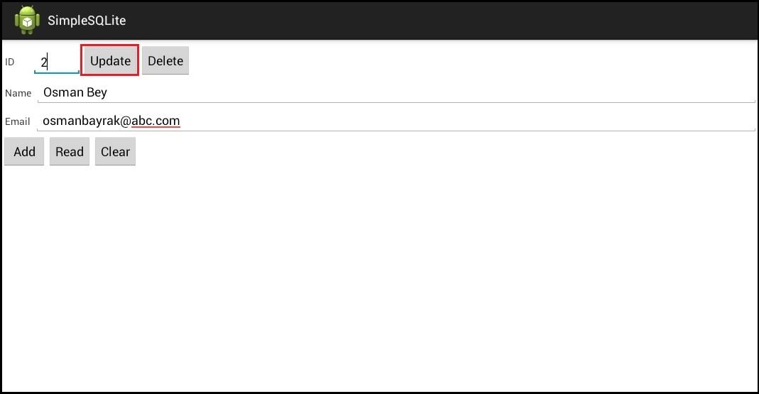final String LOG_TAG = "myLogs"; Button btnAdd, btnRead, btnClear, btnUpd, btnDel; EditText etName, etEmail, etID;...public void onCreate(Bundle savedInstanceState) {...btnUpd = (Button) findViewById(R.id.btnUpd); btnUpd.setOnClickListener(this);btnDel = (Button) findViewById(R.id.btnDel); btnDel.setOnClickListener(this);etID = (EditText) findViewById(R.id.etID); // veritabani yonetmek icin nesneyi olusturuyoruz dbHelper = new DBHelper(this); }onClick metoduna yeni komutları ekleyelim:public void onClick(View v) {// veriler icin nesneyi olusturuyoruz ContentValues cv = new ContentValues();// giris alanlardan verileri aliyoruz String name = etName.getText().toString(); String email = etEmail.getText().toString(); String id = etID.getText().toString();// veritabanıya bagliyoruz SQLiteDatabase db = dbHelper.getWritableDatabase();switch (v.getId()) { case R.id.btnAdd: ... case R.id.btnRead: ... case R.id.btnClear: ... case R.id.btnUpd: if (id.equalsIgnoreCase("")) { break; } Log.d(LOG_TAG, "--- Update mytabe: ---"); // guncellecek verileri hazirliyoruz cv.put("name", name); cv.put("email", email); // id guncelliyoruz int updCount = db.update("mytable", cv, "id = ?", new String[] { id }); Log.d(LOG_TAG, "updated rows count = " + updCount); break; case R.id.btnDel: if (id.equalsIgnoreCase("")) { break; } Log.d(LOG_TAG, "--- Delete from mytabe: ---"); // id siliyoruz int delCount = db.delete("mytable", "id = " + id, null); Log.d(LOG_TAG, "deleted rows count = " + delCount); break; } //veritabanıya baglantiyi kapatiyoruz dbHelper.close(); }