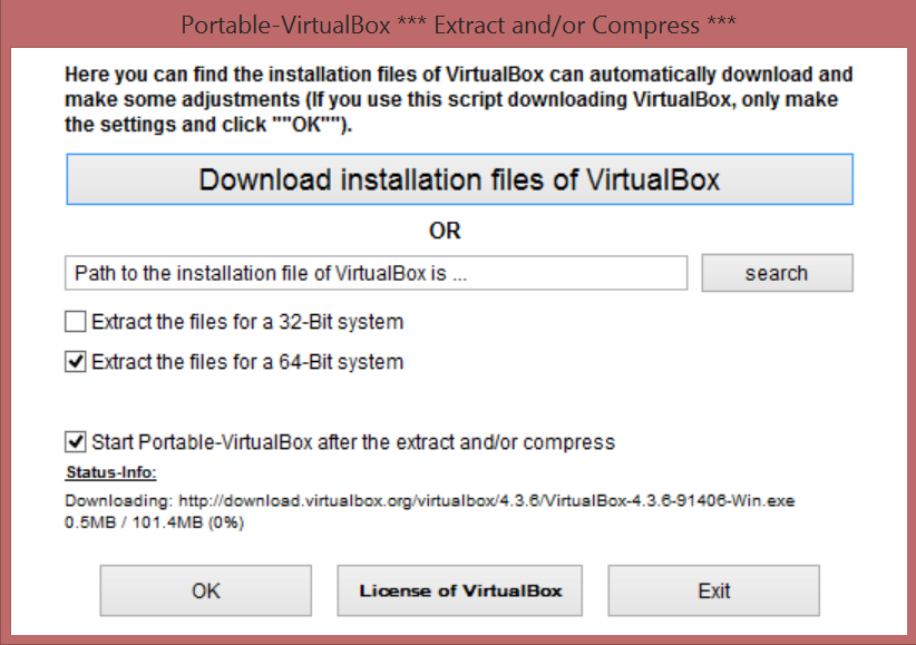 Çıkartılan dosyaları USB belleğinize attıktan sonra Portable-VirtualBox.exe dosyasını çalıştırın. Karşınıza çıkacak ekrandan “Download installation files of VirtualBox” seçeneğine tıklayın. Bu işlemden sonra yazılım 100 MB civarı dosya indirecektir. Siz de bu arada sanal makineyi kullanacağınız işletim sisteminin kaç bit olduğunu seçin. Son olarak “Start Portable-VirtualBox after the extract and/or compress” seçeneğini işaretleyin.