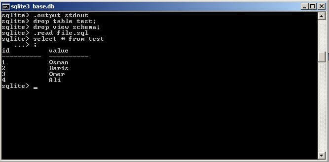 Bizim örnekte file.sql formata o yüzden .read komutu kullanacağız. İlk başta test tablodan tüm verileri silecek ve file.sql dosyadan verileri kopyalacağız. Kopyalama olup olmadığını kontrol etmek için file.sql dosyada ilk ismi değiştirelim (İlk isim Osman olsun). Değiştirmek için dosyayı Notepad ile açabilirsiniz.