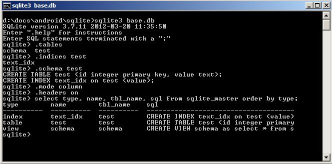 sqlite> select type, name, tbl_name, sql from sqlite_master order by type;