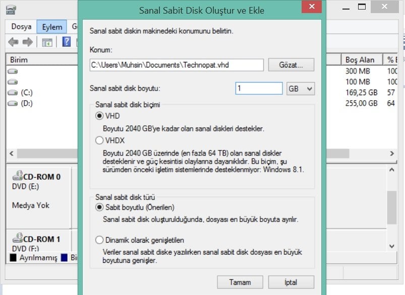 Disk Yönetimi açıldıktan sonra menüden Eylem>SSD Oluştur seçeneğine tıklayarak Sanal Sabit Disk oluşturmaya başlayabilirsiniz. Karşınıza çıkacak olan ekranda öncelikle oluşturulacak imajın nereye kaydedileceğini seçmeniz gerekmekte. Oluşturacağınız sanal diskin boyutuna göre depolama alanı yüksek bir disk seçilmelidir. İmaja isim verdikten sonra sanal diske ayıracağınız boyutu seçmeni gerekiyor. Biz test amaçlı 1 GB alan ayırdık.