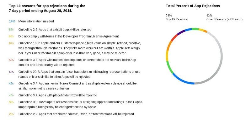 Apple bunun için 10 maddelik bir kriter listesine dikkat ettiğini belirtiyor. Geri çevrilen uygulamaların %14’ü “Tamamlanmamış Bilgi İçeriği” maddesine giriyor. Yani geliştiriciler, Apple’a gönderdikleri uygulamayı belirten formu tam olarak doldurmuyorlar. Hatta bir çoğu iletişim bilgilerini bile doldurmayı unutuyormuş. Sıklıkla karşılaşılan bu sorun yüzünden, uygulama mağazadaki yerini almıyor.