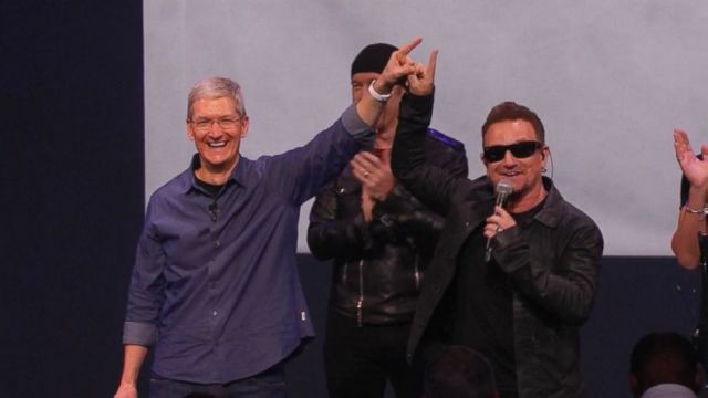 U2 grubunun en son albümü Songs of Innocence, iTunes üzerinden ücretsiz olarak sunuldu. Apple’ın etkinliği sırasında U2 da ufak bir sahne şovu yapmıştı. Tek şarkılık konserden sonra Tim Cook ve Bono, iTunes’un dünya çapında yarım milyar kullanıcıya nasıl ulaştığına dair bir konuşma yaptılar. Bu konuşmadan daha önceden senaryolaştırılmış olduğunu da belirtmek gerek.
