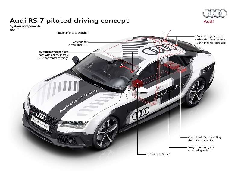 Sürücüsüz RS 7’nin görünüş olarak seri üretim modelinden bir farkı bulunmuyor. 5 kapılı aracın sadece elektromekanik direksiyonu, freni ve gazı ile 8 ileri tiptronic şanzımanı otomatik olarak kontrol ediliyor. Sürücüsüz RS7, pistteyken rotasını GPS ile belirliyor. Uydudan gelen GPS verileri, aracın ön ve arkasında yer alan 3 Boyutlu kameralar tarafından elde edilen veriler ile karşılaştırılıyor. Bilgisayar sistemi de bu bilgileri işleyerek, birkaç santimetre yanılma ile aracı rotasında tutuyor.