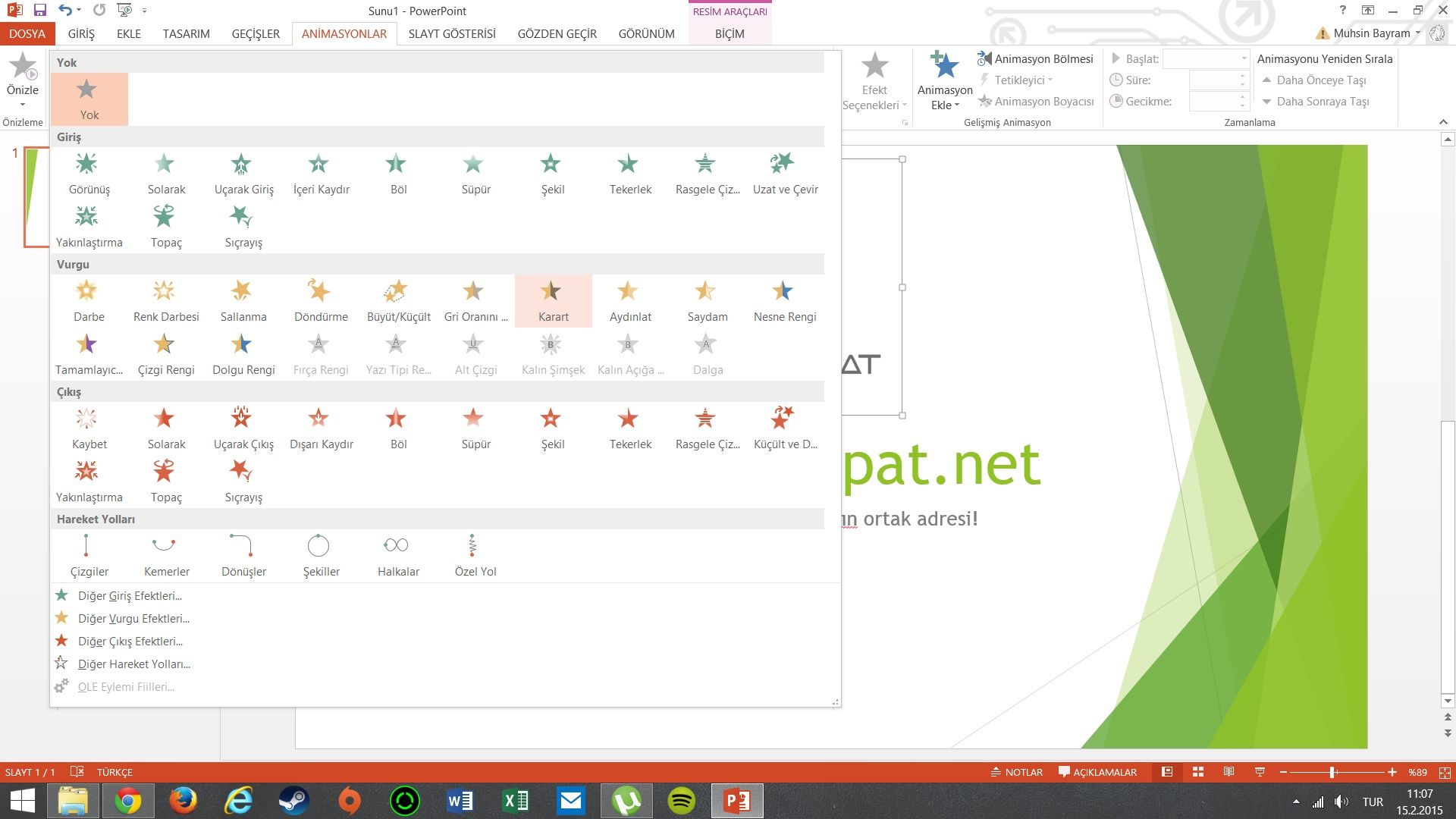Karşınıza çıkacak olan pencerede Giriş, Vurgu ve Çıkış olmak üzere üç farklı animasyon şekli göreceksiniz. Herhangi bir animasyonu seçtiğinizde PowerPoint otomatik olarak animasyonun efektini önizleme ile size gösterecektir.
