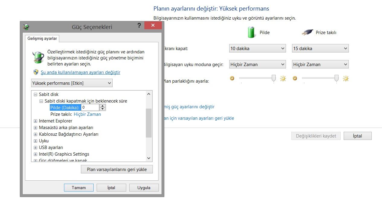 - Sabit disk>Sabit diski kapatmak için beklenecek süre>0 dakika (Hiçbir Zaman)