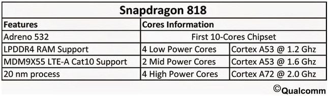 Yukarıdaki resimde Snapdragon 818 için verilen teknik özellikler açıkça görülebiliyor. Adreno 532 grafik yongası kullanılacak olan işlemcide Cat10 LTE-A radyo yongası ve LPDDR4 RAM desteği de bulunacak. Ayrıca bu işlemcinin 20 nm mimaride üretilmesi planlanıyor.