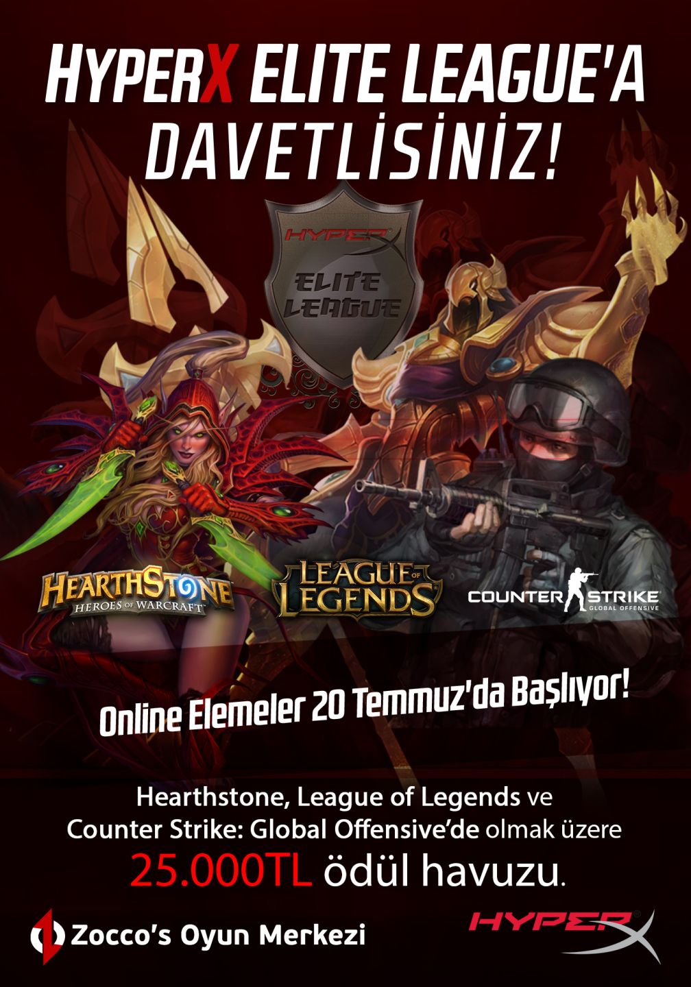 Türkiye’deki en prestijli turnuvalarından biri olma yolunda emin adımlarla ilerleyen Elite League, HyperX ile güçlerini birleştiren, deneyimli ve öncesinde bir çok turnuvaya ev sahipliği yapmış Zocco’s Oyun Merkezi organizatörleri tarafından düzenlenmektedir.