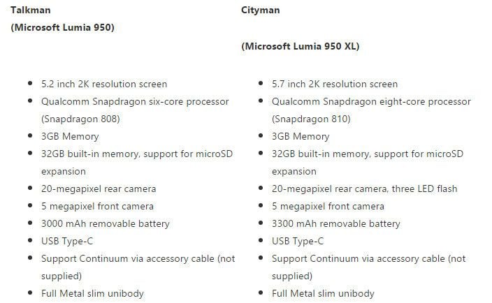 Yeni bir söylentiye göre, şirket içindeki proje isimleri Talkman ve Cityman olan bu iki yeni telefon, piyasaya Lumia 950 ve Lumia 950 XL isimleri altında çıkacaklar. Her iki telefon da metal alaşım gövdeye ve USB Type-C bağlantı portuna sahip olacaklar.