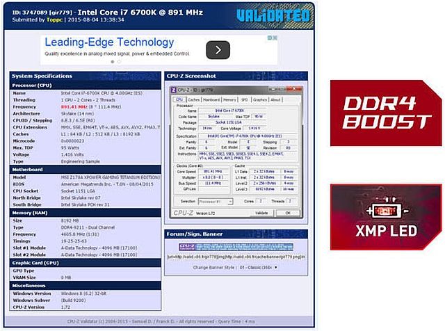 MSI’ın yeni Z170 tabanlı anakartı MSI Z170A XPOWER GAMING TITANIUM EDITION, yüksek hızaşırtma performansını dual-channel DDR4 bellek üzerinde göstererek 4605MHz saat hızıyla dünyanın bugüne kadar gördüğü en yüksek DDR4 bellek frekansına imza attı. Bu rekor, MSI’ın DDR4 BOOST teknolojisinin Intel’in yeni Z170 anakartlarda bellek performansını ne kadar etkili bir şekilde optimize edebildiğini gösteriyor. Bu başarı ile yeni Z170A XPOWER GAMING TITANIUM EDITION hem tek kanallı bellek hızının sınırlarını zorluyor, hem de dual-channel belleklerde de şaşırtıcı bir performans sergiliyor.