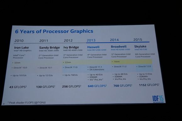 Skylake’in grafik performansı kağıt üstünde de oldukça ilerlemiş gözüküyor. Intel’in duyurduğu üzere Skylake mimarisinin içindeki dahili grafik işlemcileri 1100 GFLOPS değerine sahip. Bu değer Haswell’de 640, Broadwell’de ise 768 GFLOPS’tu.