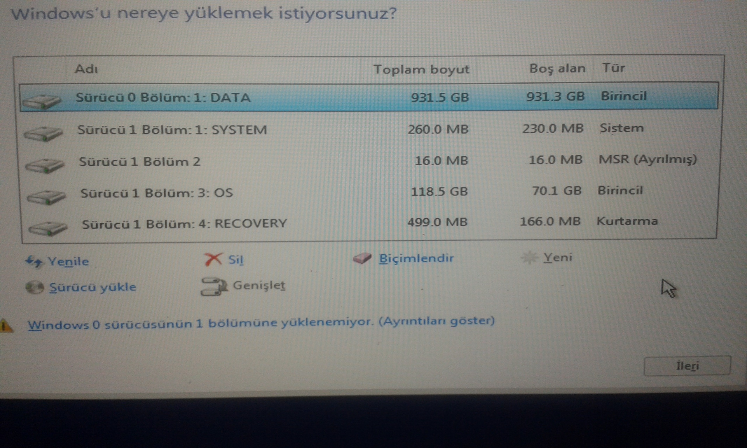Uefi kurulum yaparken yeni bölüm oluşturamıyorum