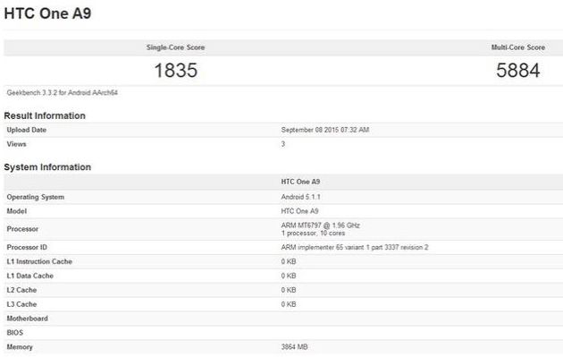Benchmark sonucuna göre HTC One A9 telefonu, Android’in 5.1.1 Lollipop işletim sistemini kullanıyor ve MediaTek’in yeni nesil işlemcisi olacak 10 çekirdekli Helio X20 modelinden güç alıyor. Bu çekirdeklerden 4 tanesi hafif işlemler gerçekleştirilirken kullanılan 1,4 GHz hızındaki Cortex-A53 olacak. Orta düzey işlemler için 2,0 GHz hızında 4 adet Cortex-A53 yer alacak. Son olarak yüksek grafikli oyunları oynatmak gibi zorlu işlemler içinse 2,5 GHz’lik iki adet Cortex-A72 çekirdeği görev alacak. Telefonda ayrıca 4 GB RAM ve teorik olarak 300 Mbps indirme ve 50 Mbps yükleme hızına imkan veren LTE Cat.6 ağ bağlantı desteği yer alıyor.