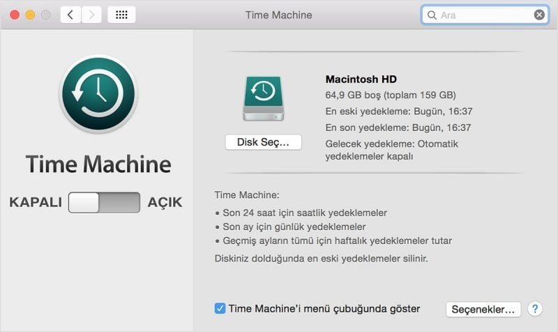 Öncelikle Time Machine’in nasıl çalıştığına bakalım. Apple’ın varsayılan yedekleme aracı; sisteminizi son 24 saat için saatlik, son bir ay için günlük ve geri kalan bütün aylar için haftalık olarak yedekler. Tabii ki bu yedekleme işlemi, hedef depolama biriminin kapasitesi ile sınırlıdır.