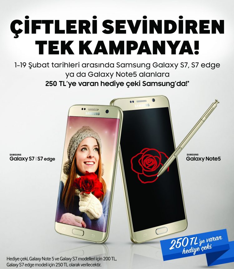 Samsung Türkiye’nin Şubat kampanyasında Galaxy Note 5 ve Galaxy S7 telefon alanlara 200 TL hediye çeki kampanyası başladı. Galaxy S7 Edge modeli için bu hediye çeki 250 TL olarak açıklandı.