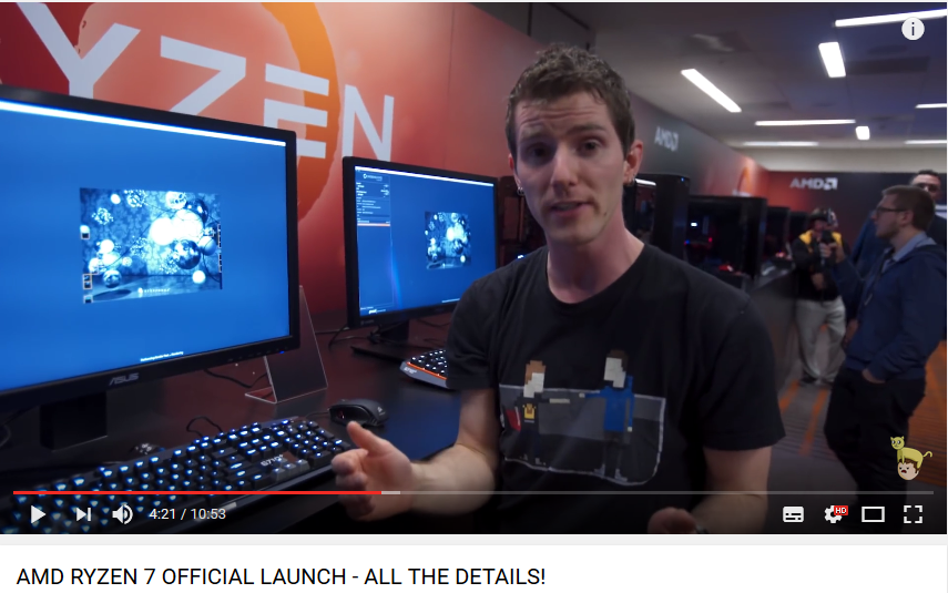 AMD sistem Ryzen R7 1800X işlemciye sahip. 16 GB DDR4 RAM, 240 GB SSD ve Radeon RX 480 GPU mevcut. RAM miktarını AMD bazı testlerde kendi sisteminde daha az tutuyor, buradaki mesaj dezavantajlı durumda bile yüksek performans ile çok ciddi bir rekabet sağlandığı yönünde. Gerçekten de performans sonuçları etkileyici.