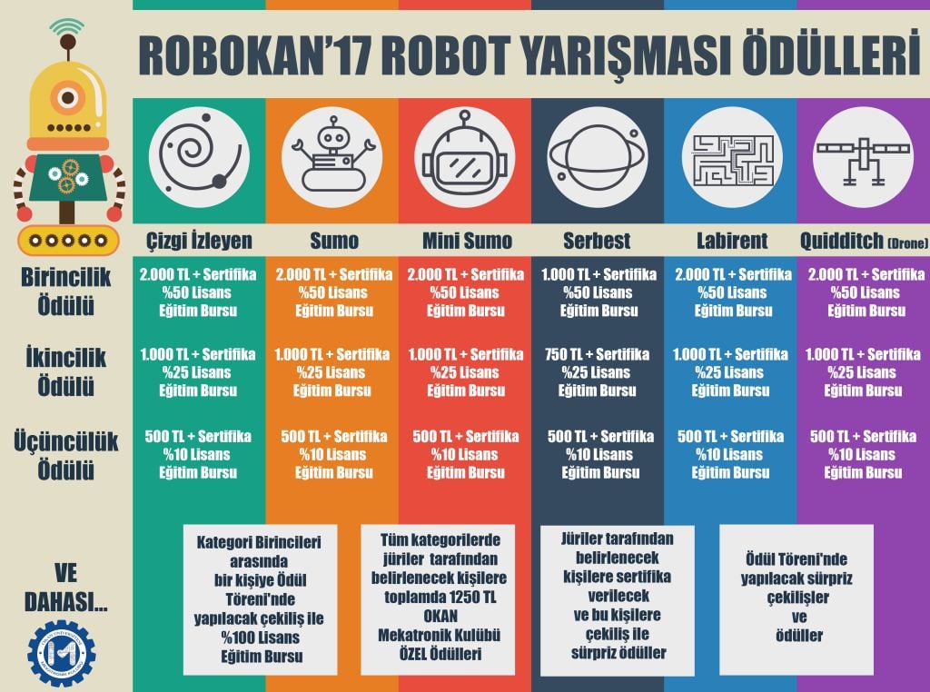 Aşağıda ROBOKAN’17 Robot Yarışması bünyesinde katılımcılara verilmesi planlanan ödüllerin bir listesini görebilirsiniz. Okan Mekatronik hakkında daha fazla bilgi almak için de buradaki bağlantıya tıklayarak resmi web sitesini ziyaret etmenizi tavsiye ederiz.