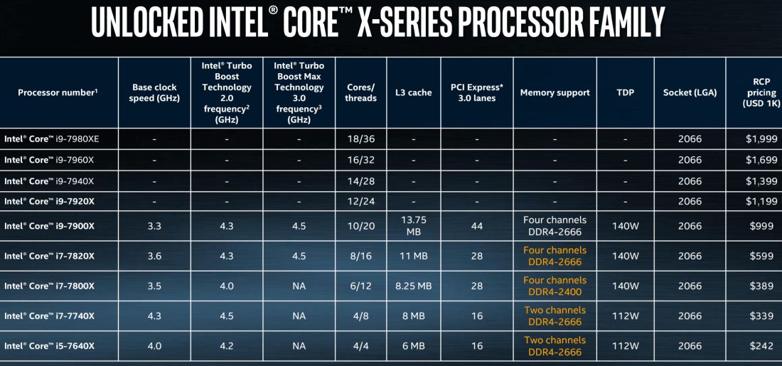 Core X ailesinin en tepesindeki model i9-7980XE olarak adlandırılmış. 18 çekirdekli ve 36 iş parçacığı barındıran bu modelin Amerika satış fiyatı 2,000 dolar civarında olacak. Diğer modeller ise daha az çekirdek ve daha düşük fiyatlarla çıkacak.