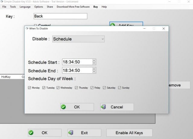 Tuşu seçtikten sonra Add Key butonuna tıklayarak tuşu nasıl devre dışı bırakmak istediğinizi seçebilirsiniz. Eğer tuşu tamamen devre dışı bırakmak istiyorsanız Always seçeneğini tercih edin. Eğer tuşu belirli bir programda devre dışı bırakmak istiyorsanız Program seçeneğini işaretleyip istediğiniz programı seçin. Son olarak seçilen tuşu belirli zaman dilimlerinde devre dışı bırakmak için Schedule seçeneğini kullanın ve dilediğiniz zaman dilimini işaretleyin.